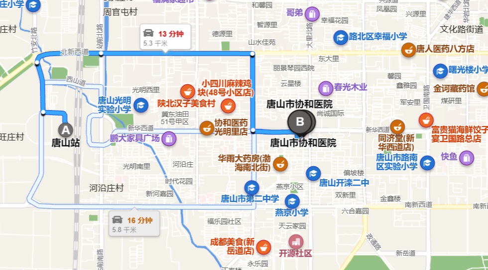 3、唐山站下午7:25 出發(fā)河北省唐山市站前路160號 離開,朝廣場北路方向前進96 米向右轉(zhuǎn)上廣場北路0.3 千米向右轉(zhuǎn)上竹安南路0.6 千米向右轉(zhuǎn)上S361 / 北新西道0.8 千米保持直行方向上北新西道1.8 千米向右轉(zhuǎn)上友誼南路0.9 千米向左轉(zhuǎn)上新華西道0.6 千米向右轉(zhuǎn)上道路10 米向右轉(zhuǎn)上道路0.1 千米到達左側(cè)上一個十字路口是新華西道如果您到達大里南路,說明您走得太遠了唐山市協(xié)和醫(yī)院